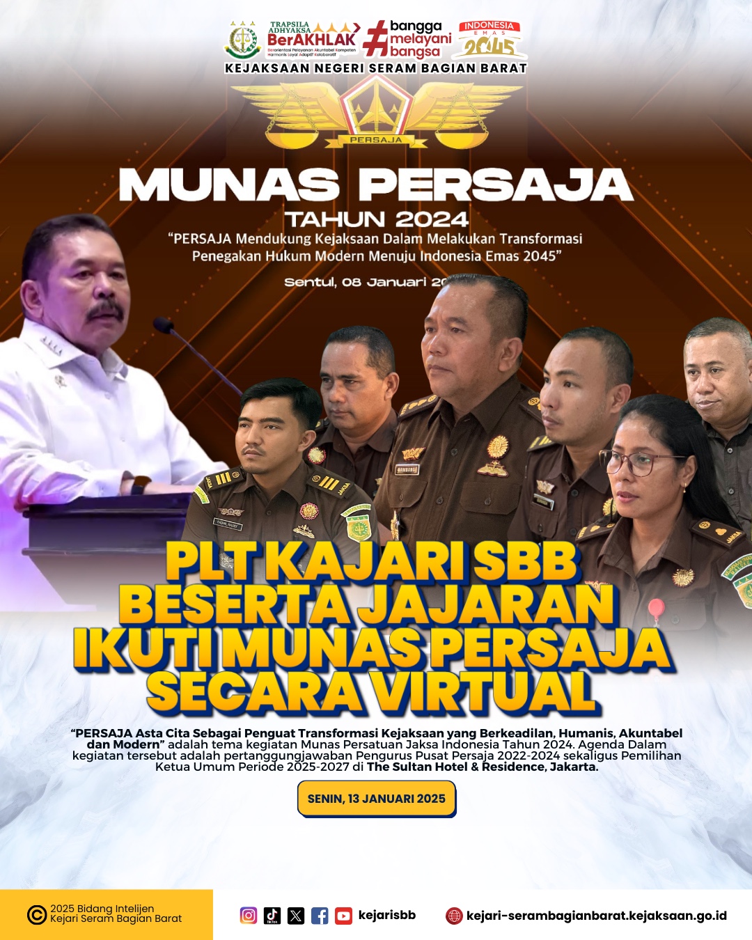 Melalui Zoom Video Conference, Plt Kejari SBB Beserta Jajaran Mengikuti Munas PERSAJA Tahun 2025 Senin, 13/01/2025 | 21:03