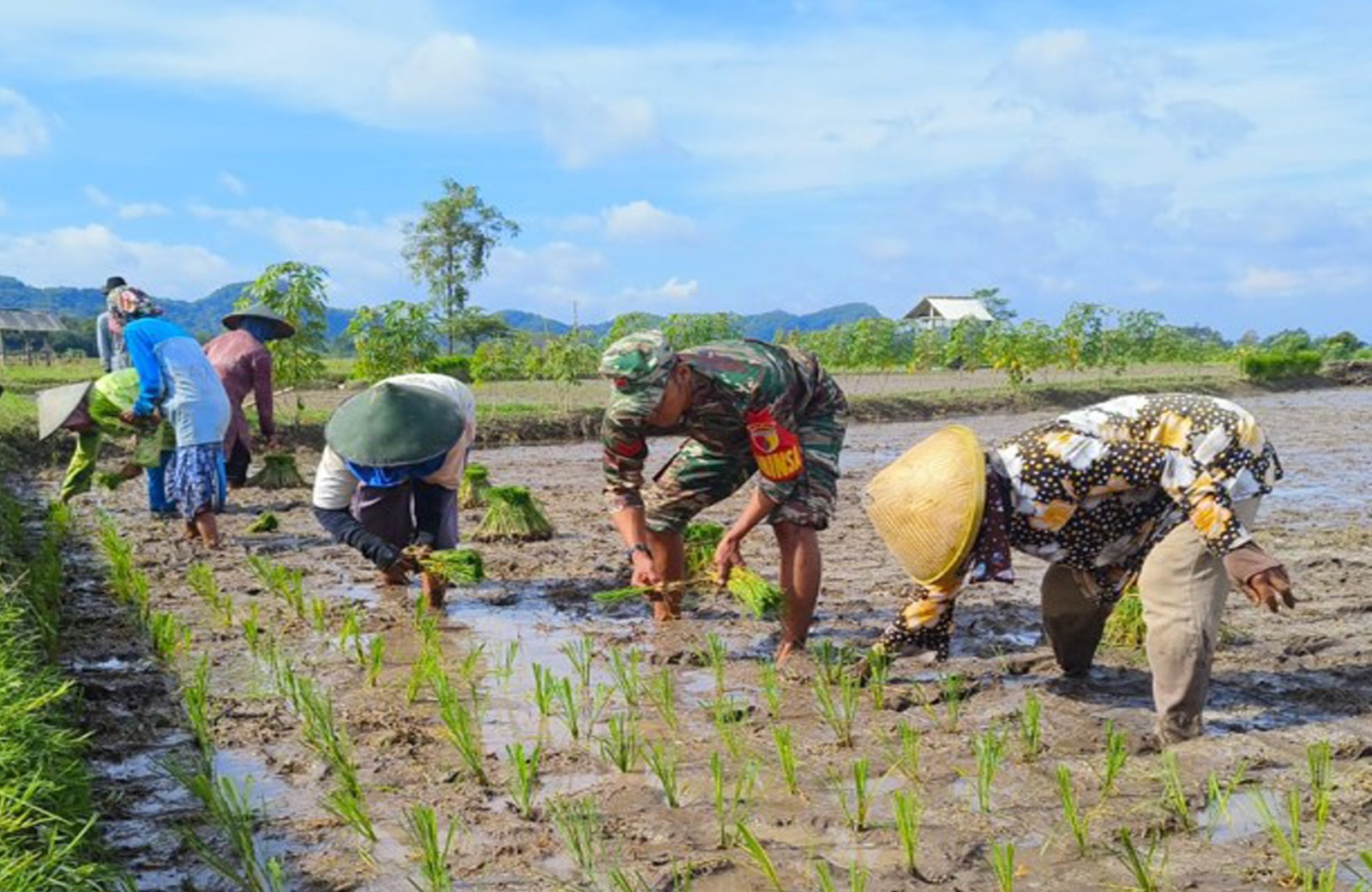 Kegiatan tanam padi yang dilakukan di area persawahan Desa Ponggok ini melibatkan kelompok tani setempat. Para petani terlihat antusias dengan kehadiran Babinsa, yang tidak hanya memberikan arahan, tetapi juga ikut turun langsung ke sawah bersama mereka.