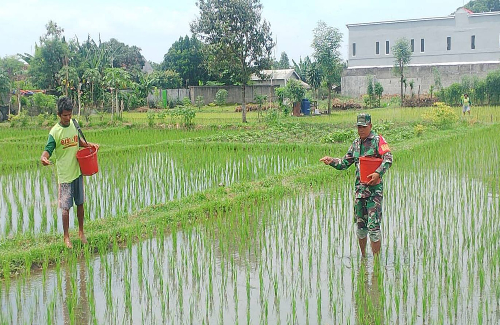 Blitar - Dalam upaya mendukung program ketahanan pangan nasional, Bintara Pembina Desa (Babinsa) Kelurahan Sananwetan Koramil 0808/20 Sananwetan Kodim 0808/Blitar Sertu Anton turun langsung ke sawah membantu petani dalam proses pemupukan tanaman padi, yaitu milik Bapak Sayuti anggota Poktan Rahayu Jl. Kangean Kel./Kec. Sananwetan Kota Blitar, Minggu (16/2/2025).
