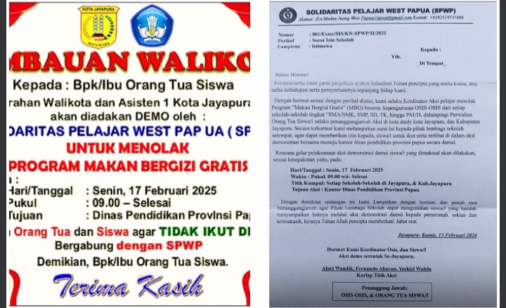 Jayapura - Menindak lanjuti satu buah surat yang diunggah dari grup WA yang berasal dari yang mengatasnamakan Solideritas Pelajar West Papua (SPWP) yang beralamat di jalan Medan Juang West Papua (Papua ///spwp.gmail.com) hp.no.082319737496, dengan Nomor Surat,001/Exter/SIS/KN-SPWP/II/2025, tertanggal,13 Ferbuari 2025 dengan Perihal: Surat Izin Sekolah, Dengan Lampiran yang sifatnya, istimewa.